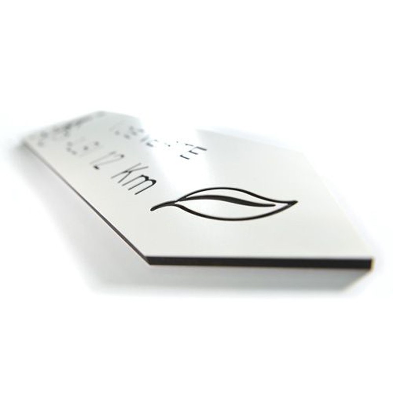 Le texte de cette flèche PVC est réalisé par gravure de la matière noire.