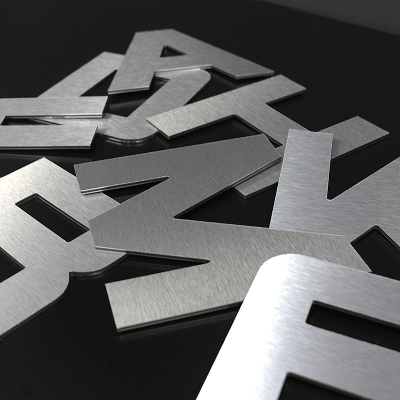 Découpe de lettres en ALU DIBOND BROSSE ARGENT de 3mm d'épaisseur.