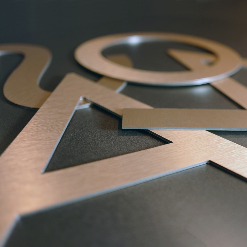 Découpe de lettres en ALU DIBOND BROSSE CUIVRE de 3mm d'épaisseur.
