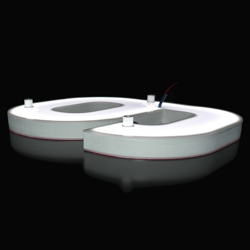 Finition Plexi blanc diffusant, avec ou sans film adhésif translucide couleur.