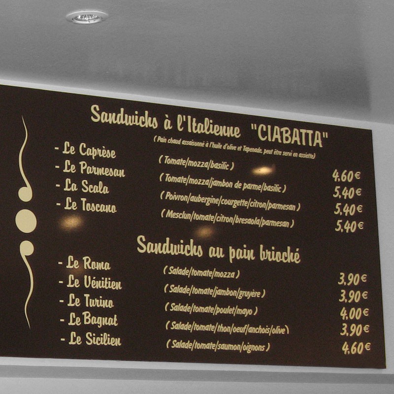 Les textes et les images de ce panneau PVC sont réalisés au moyen de découpe de lettres adhésives ou en impression numérique.